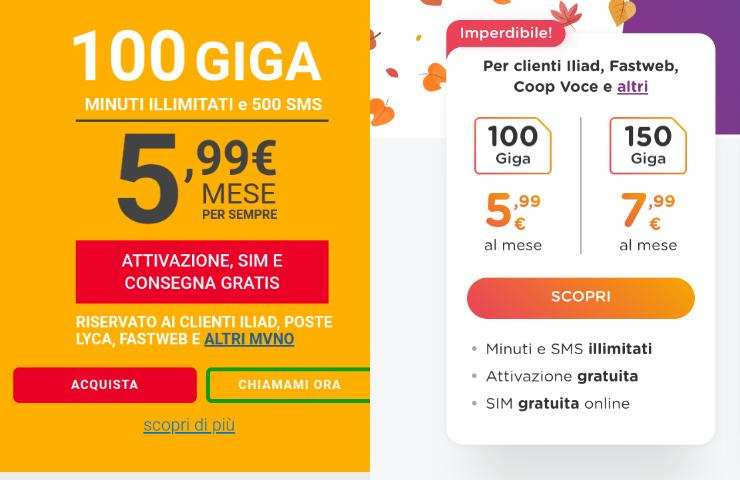 Questa offerta Kena Mobile è destinata agli operatori mobili virtuali. Una seconda offerta sempre destinata agli operatori mobili virtuali permette di avere 150 GB e le stesse condizioni contrattuali a 7,99 euro al mese. Un altro operatore telefonico con offerte che comprendono molti giga e permette di avere anche minuti ed sms sempre illimitati è ho mobile. Anche l’operatore viola su rete Vodafone offre infatti 100 GB a 5,99 euro al mese e 150 GB a 7,99 euro al mese.