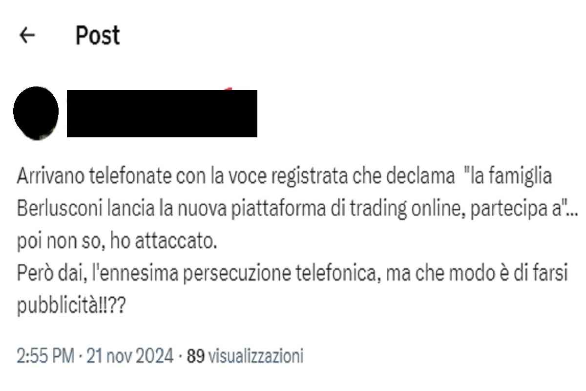 La segnalazione arriva da alcuni utenti X, per poi diventare virale: arriva una chiamata e una voce registrata dice di parlare a nome della famiglia Berlusconi. Ma che cosa sta accadendo? Si tratterebbe di una truffa telefonica bella e buona, come segnala anche un sito specializzato, in cui arrivano decine e decine di segnalazioni degli utenti tutti i giorni.