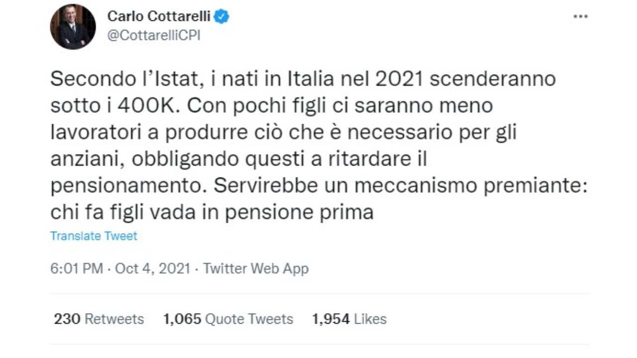 Sicuramente Carlo Cottarelli è qualcuno la cui opinione va quantomeno ascoltata. Questo il testo completo del suo Tweet “Secondo l’Istat, i nati in Italia nel 2021 scenderanno sotto i 400K. Con pochi figli ci saranno meno lavoratori a produrre ciò che è necessario per gli anziani, obbligando questi a ritardare il pensionamento. Servirebbe un meccanismo premiante: chi fa figli vada in pensione prima“.