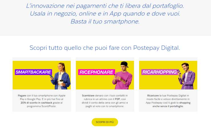 La Postepay Digital permette di effettuare pagamenti, trasferire denaro ad altre carte Postepay e fare acquisti nei negozi e online semplicemente utilizzando il cellulare. Per richiedere la carta digitale di PostePay basta accedere al sito ufficiale di Poste Italiane oppure attraverso l’app. Se siete in possesso delle credenziali Spid, di cui Poste Italiane è un provider, ci vogliono pochi secondi per essere riconosciuti e poter così cominciare a trasferire i fondi e ad utilizzare la carta attraverso il cellulare per i pagamenti. La ricarica della Postepay Digital può essere effettuata in ufficio postale, presso un ATM Postamat, sul sito di Poste Italiane, oppure utilizzando anche il servizio Postepay Open, se volete trasferire fondi da altri istituti bancari sulla vostra carta.