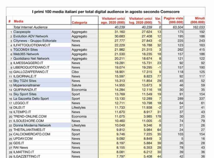Classifica informazione on line: Web365 sale al sesto posto